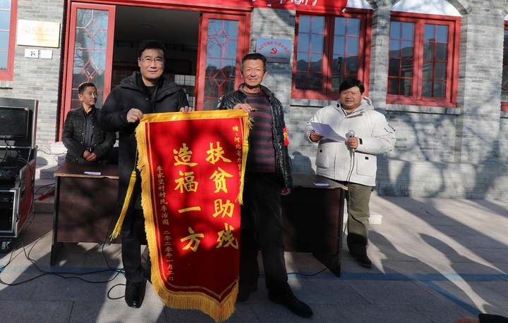 在见面会上,村支书刘秀明代表李家堡村给公司送上“情系百姓办实事,爱心帮扶暖人心”的锦旗,村民李治国送来“扶贫助残,造福一方”锦旗。