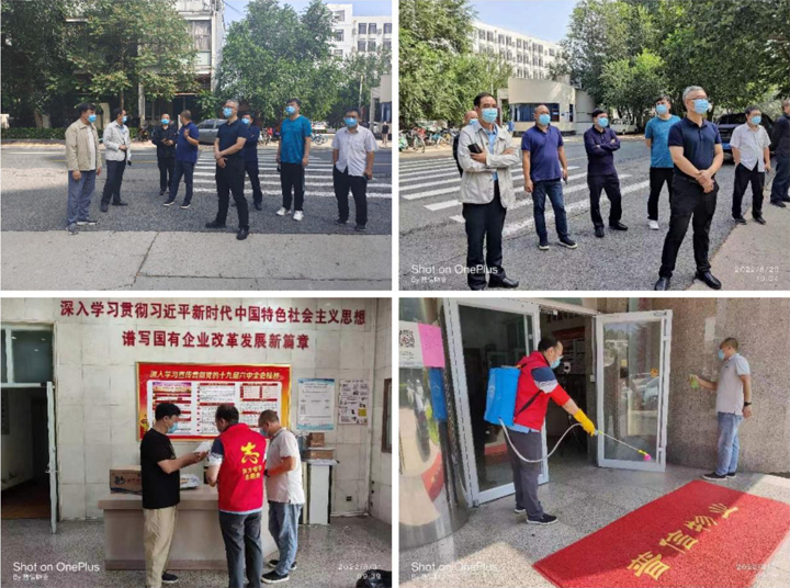 勇当坚守一线的“守门员”:省外贸资产公司党委坚决贯彻落实省、市两级应对新冠肺炎疫情工作领导小组和省国资委党委的各项部署和要求,公司党委书记、董事长张元贞同志亲自安排部署,第一时间组建以党委副书记齐山水、副总经理杨建卓为组长的疫情防控一线指挥部,自8月27日起,与综合办公室、改革发展部相关人员共同坚守岗位,及时传达上级疫情防控要求,督导经营场所疫情防控工作,保证公司系统各项工作顺利开展;河北设备公司党委副书记、董事、总经理赵全利在小区封控前第一时间赶到公司,与财务部经理赵杰、储运部经理徐菁连续多天在公司值班坚守,协调、调度、处理公司运营中的紧急事务;东方信华、普信物业及相关值守人员对飞翼路1号、飞翼路8号以及翔翼路39号院进行全面消杀,对公司及租户所有人员进行全面摸排,真正做到了“我为群众办实事”,让员工、居民体会到党的温暖;河北医保公司物业管理部相关人员连续坚守岗位,每日坚持消杀和安全巡查,为职工和租户创造安全办公环境。