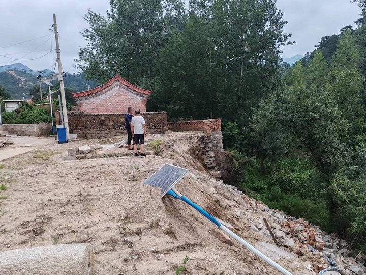 村中行洪沟受洪水冲击和村内排水冲刷,村西侧观音庙的护坡出现险情,地面形成5厘米多的裂缝,应急救援小组立即组织村民转移了坡上停放的车辆,仅半小时后,护坡轰然坍塌,坡上石碾和路灯滑入行洪沟。